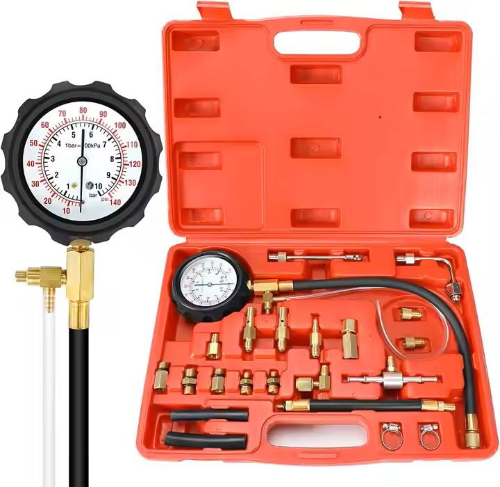 *90mm fuel pressure gauge tester to feature a shockproof rubber casing and a large dual-scale dial with readings in psi and bars